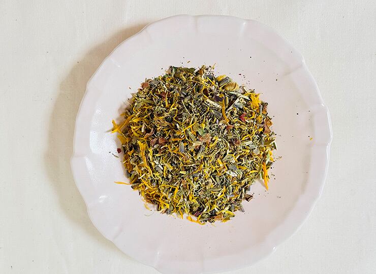 カレンデュラ、ラベンダー、セージ、レモンバーム、セントジョーンズワート、パッションフラワー、ローズ(旬のハーブを使用するため、時期によっては内容物が若干変更になる場合があります。)
